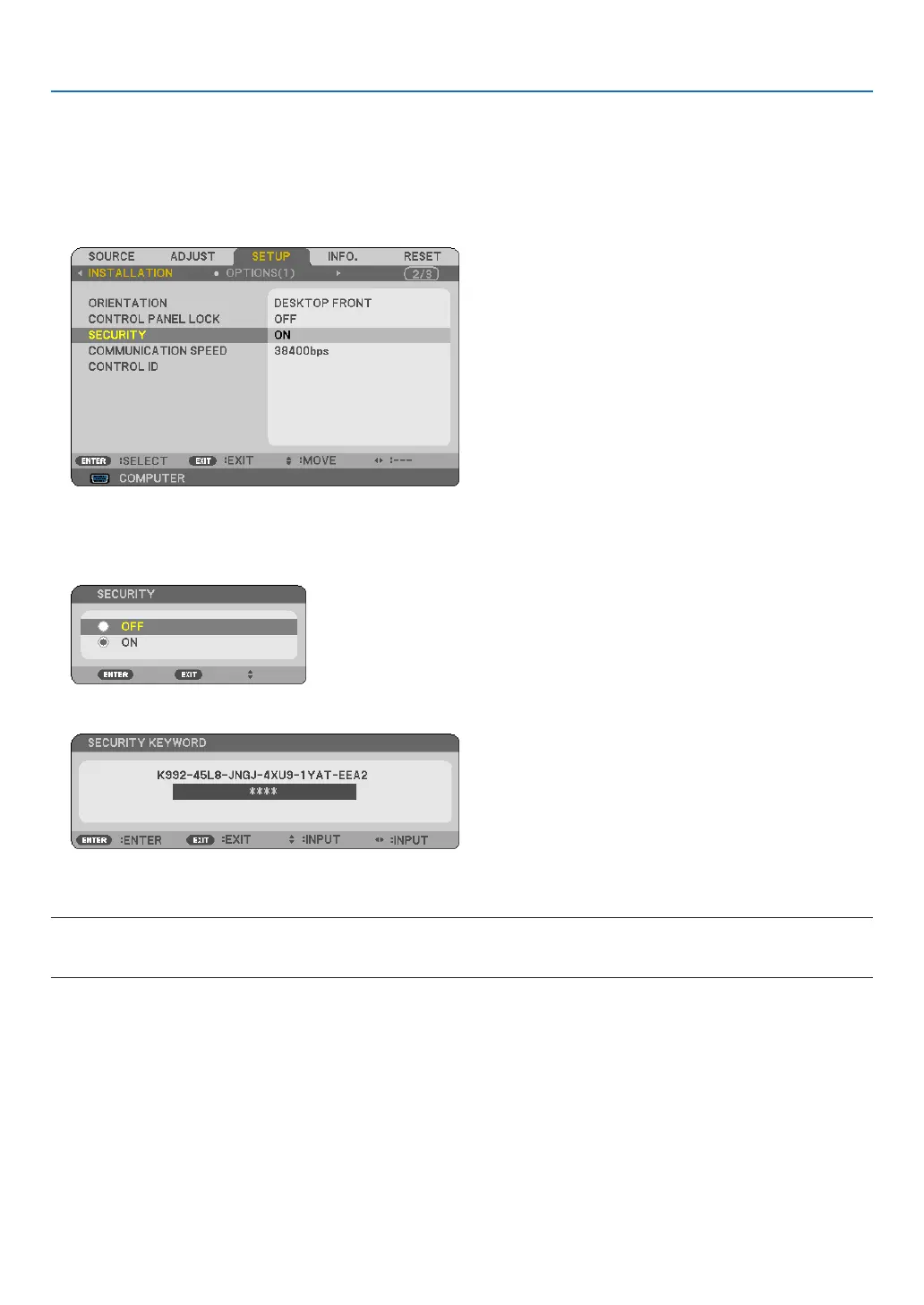 2. Select [SETUP] → [INSTALLATION] → [SECURITY] and press the ENTER button.