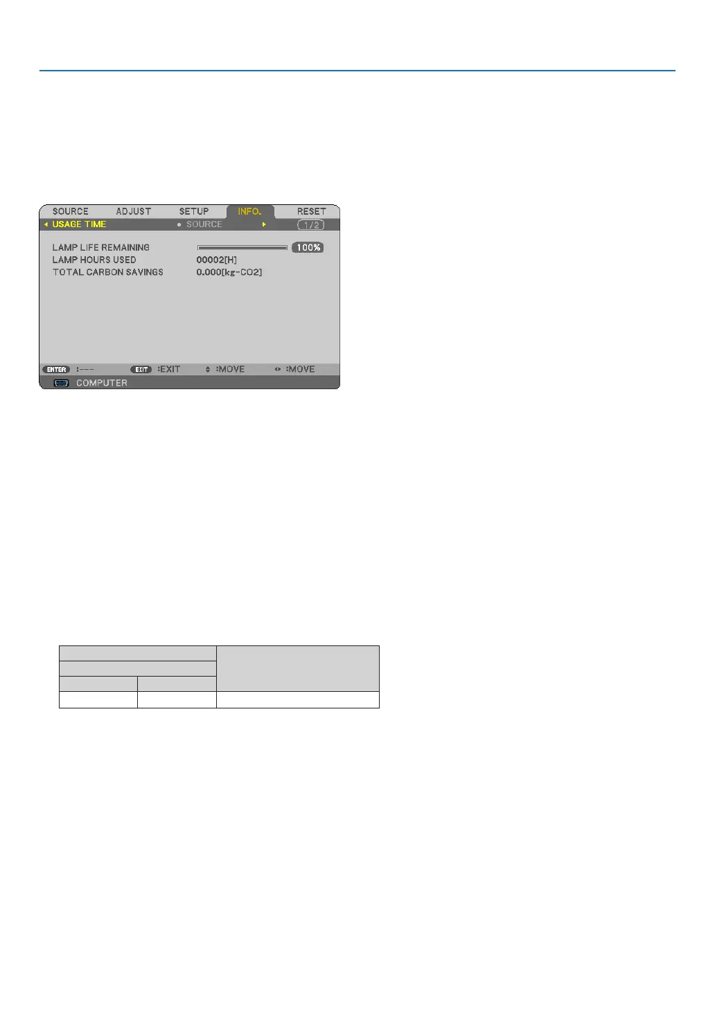 The value informs you of the amount of lamp usage. When the remaining lamp time reaches 0, the LAMP LIFE