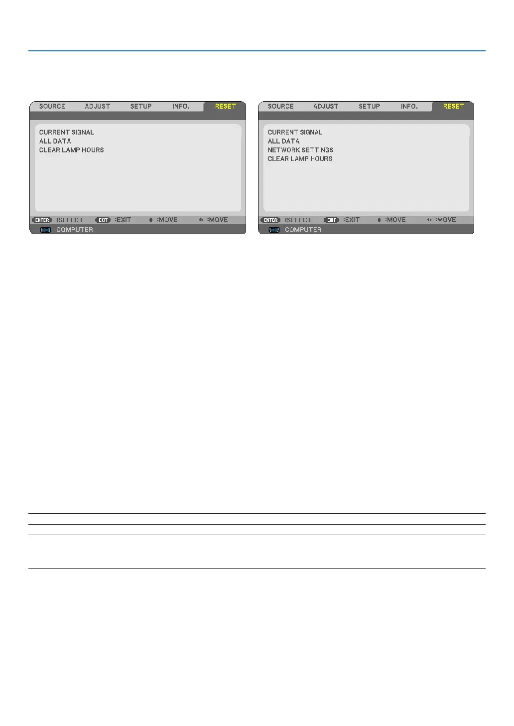 NOTE:Elapsedtimeofthelampusewillnotbeaffectedevenwhen[RESET]isdonefromthemenu.