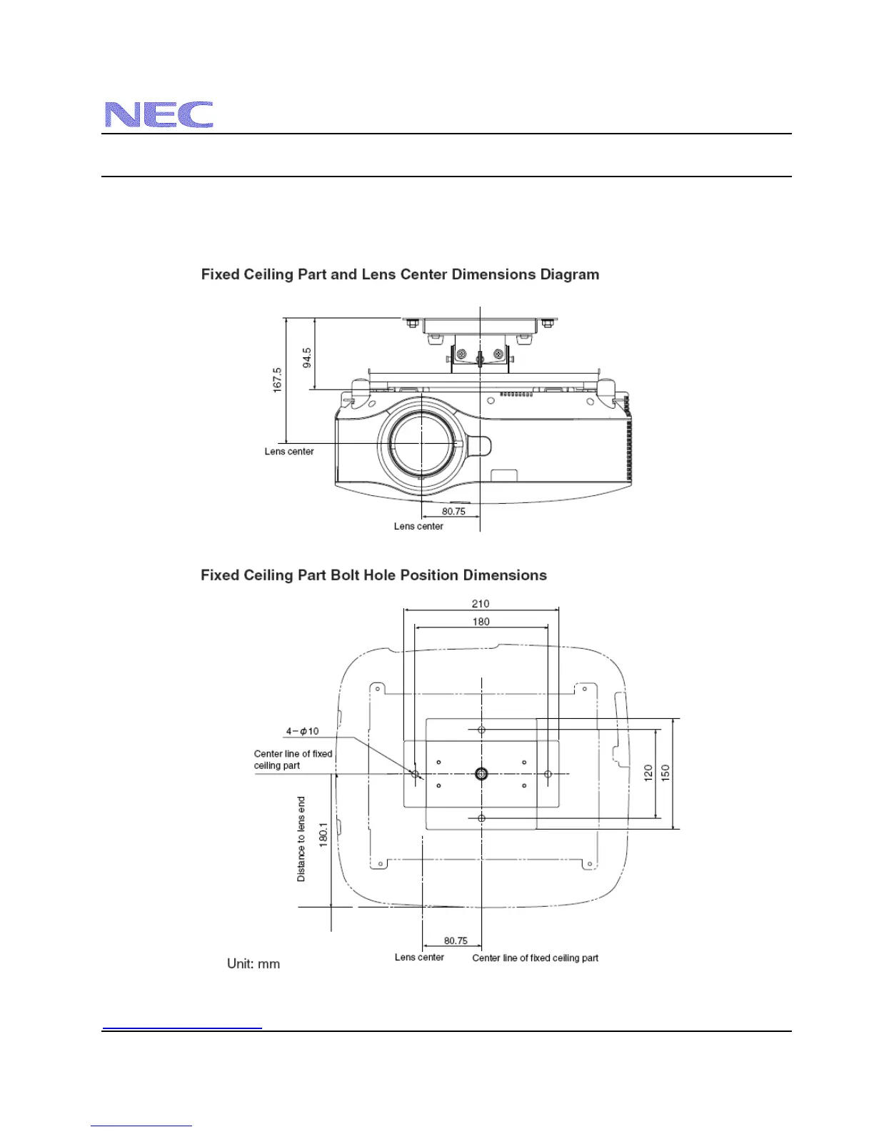 The following diagrams show ceiling mount dimensions for the NP3150.