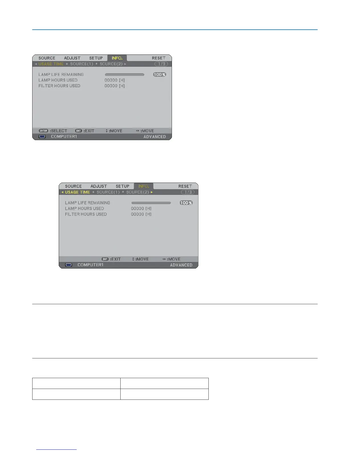 • When the remaining lamp time reaches 0, the Lamp Life Remaining bar indicator changes from 0% to 100 Hours and the