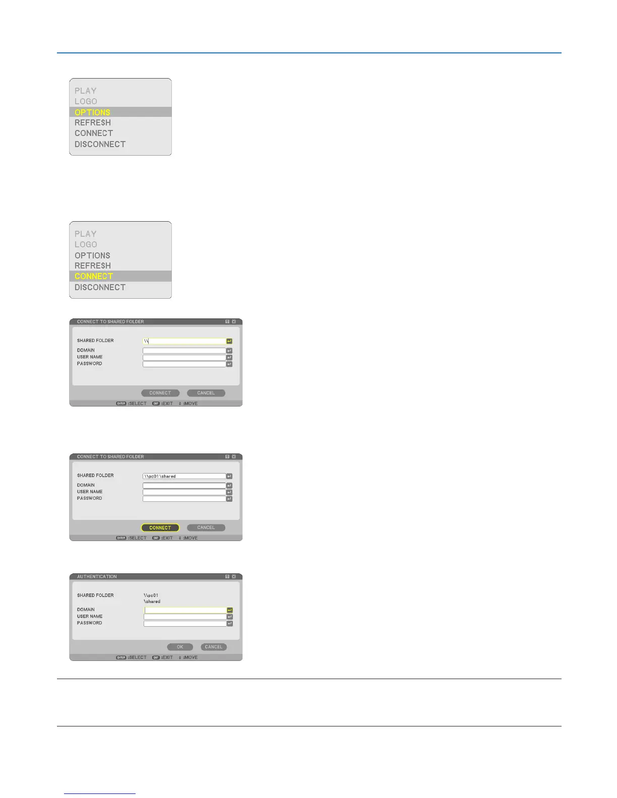 4. Enter the path for the shared folder. Select [CONNECT] and press the ENTER button.
