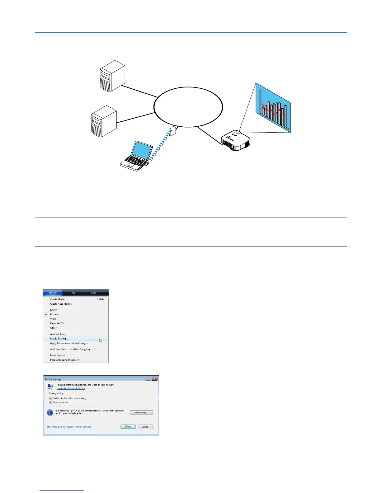 For computer: Prepare image files or movie files to be projected, and set up “Media Sharing” in Windows Media