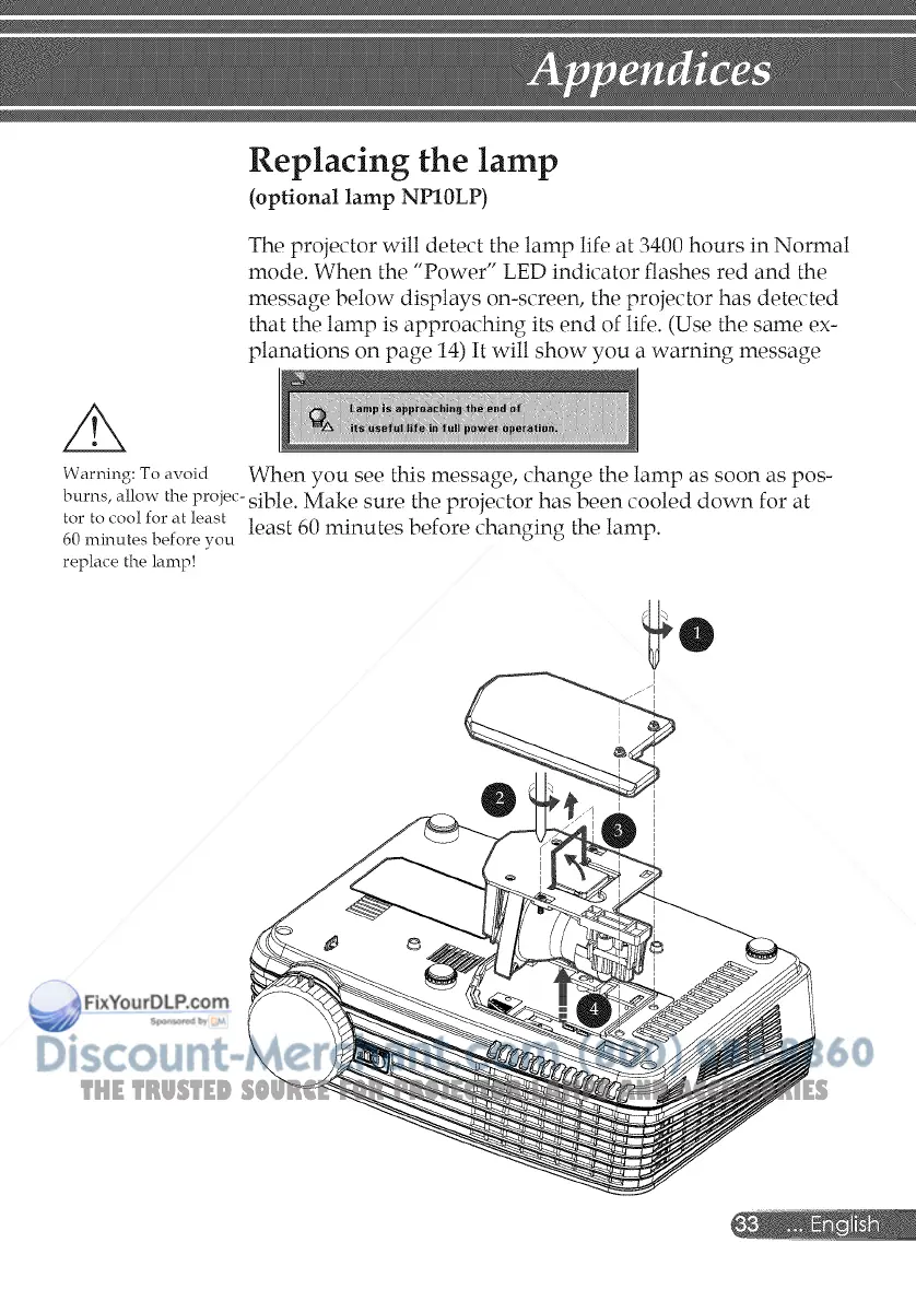 Warning: To avoid When you see this message, change the lamp as soon as pos-