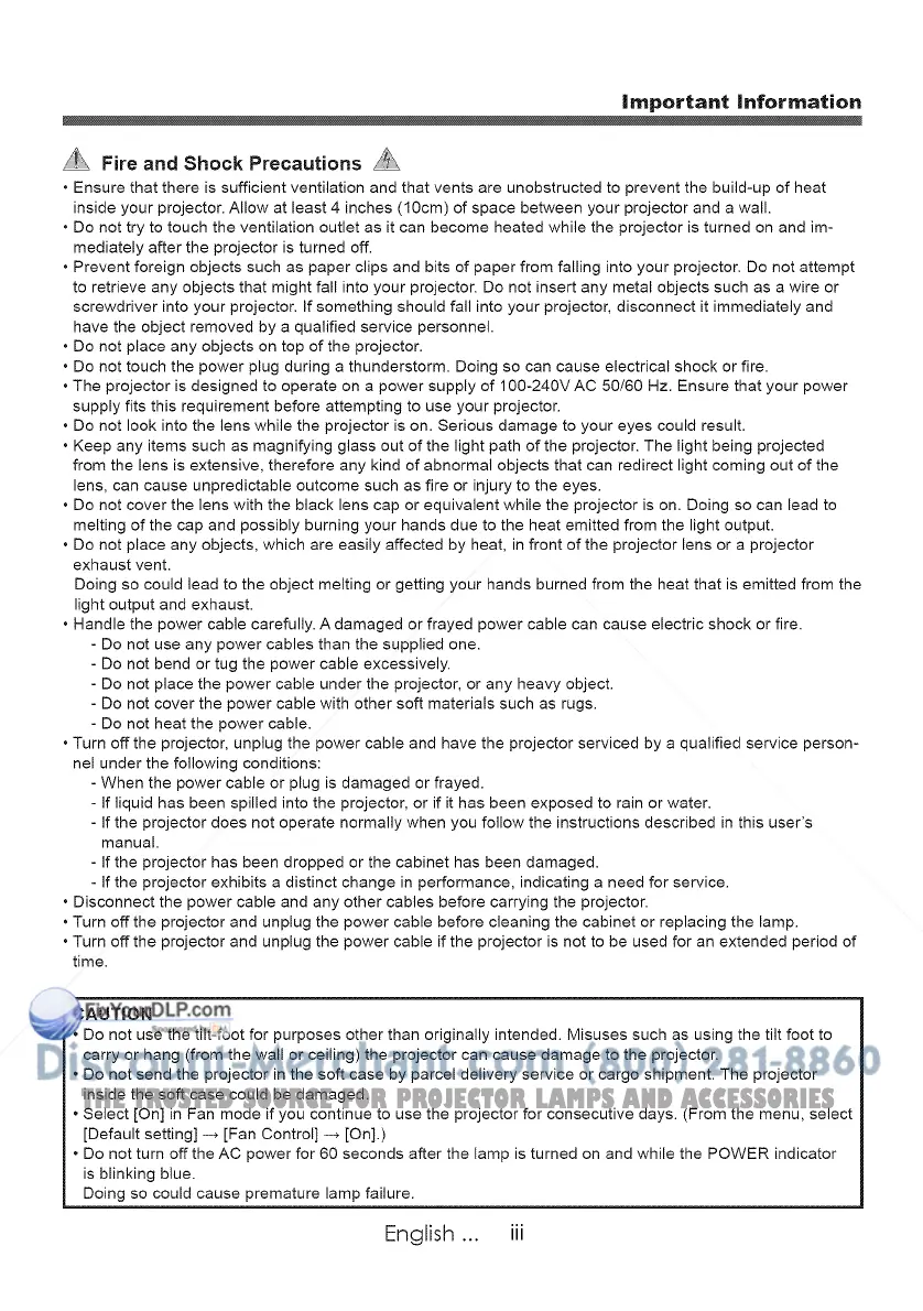 screwdriver into your projector. If something should fall into your projector, disconnect it immediately and