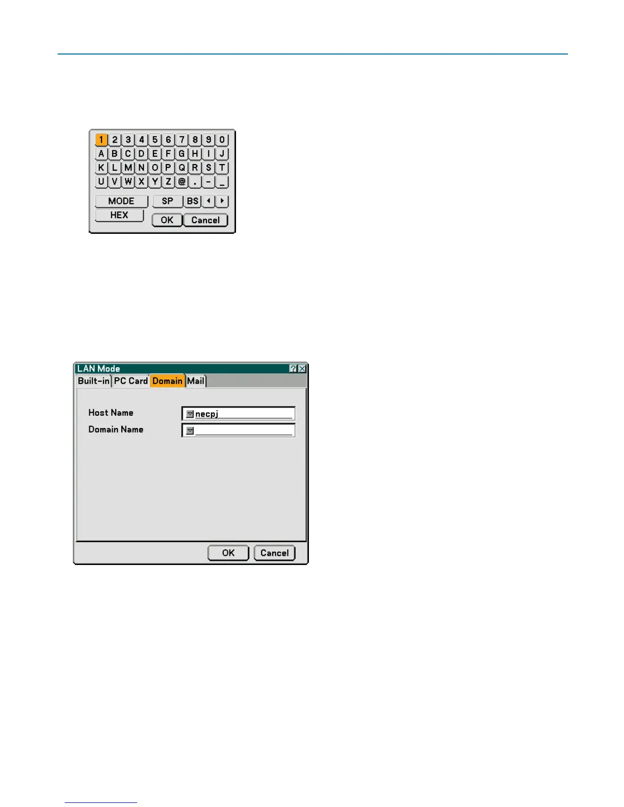 Domain Name ....... Type in domain name of the network connected to the projector. Up to 60 alphanumeric characters can be