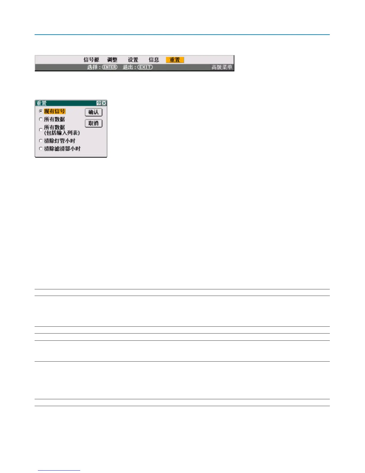 重置功能可以使您通过下列方法将信号源的调整和设置切换到工厂预置