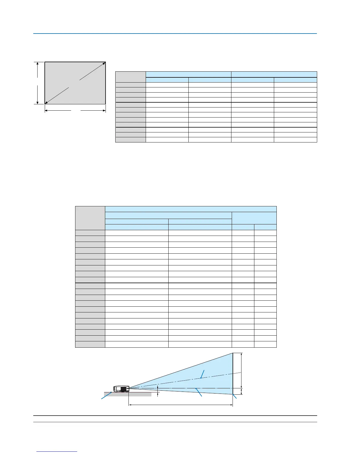 使用标准镜头时桌面投射的屏幕尺寸和投射距离
