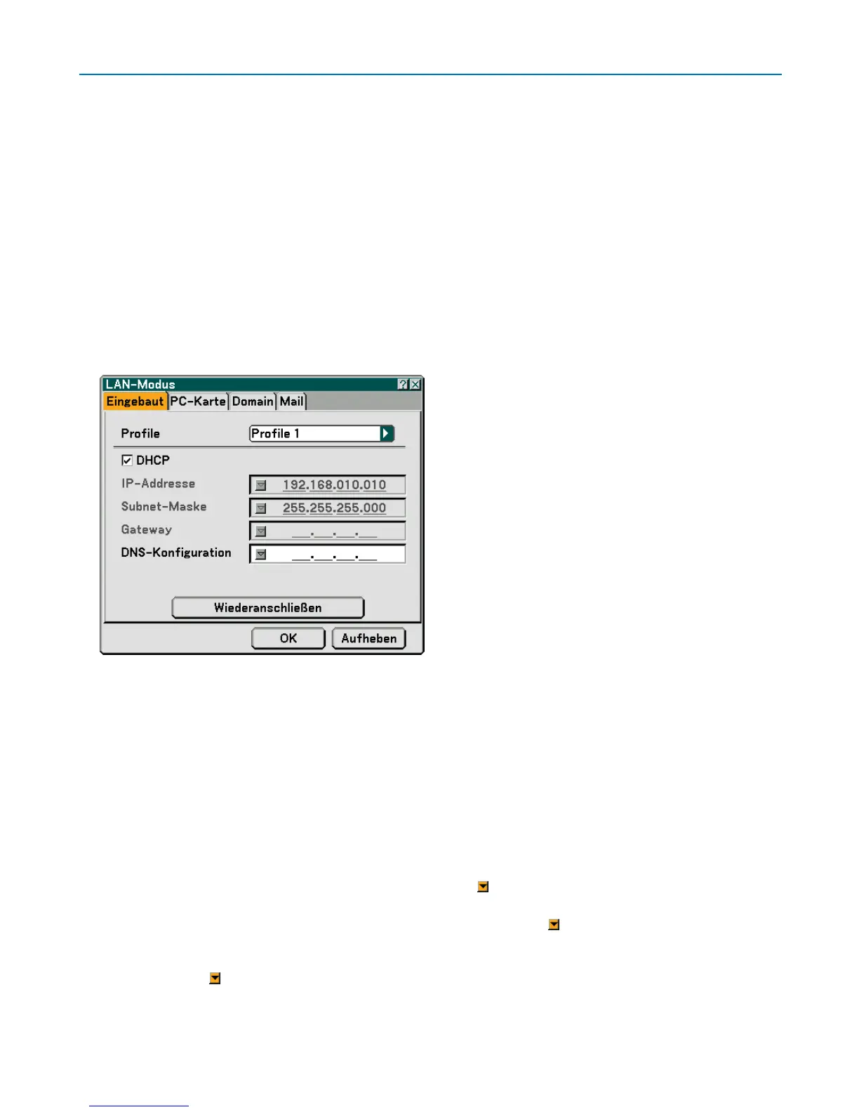 Wählen Sie [Profile 1] oder [Profile 2] und nehmen Sie dann die Einstellungen für [DHCP] und die anderen Optio-