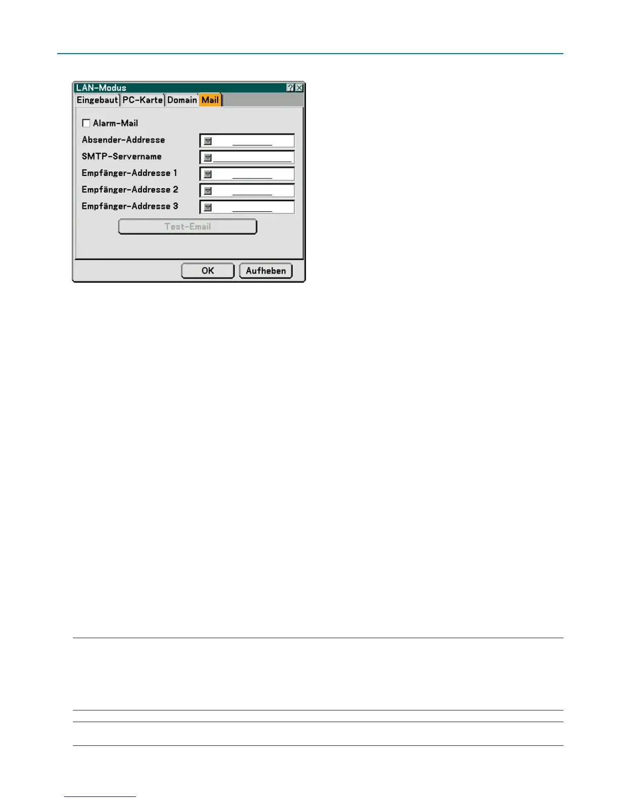 • Sofern nicht [Absender-Adresse], [SMTP-Servername] oder [Empfänger-Adresse 1-3] ausgewählt ist, steht, [Test-Email] nicht zur