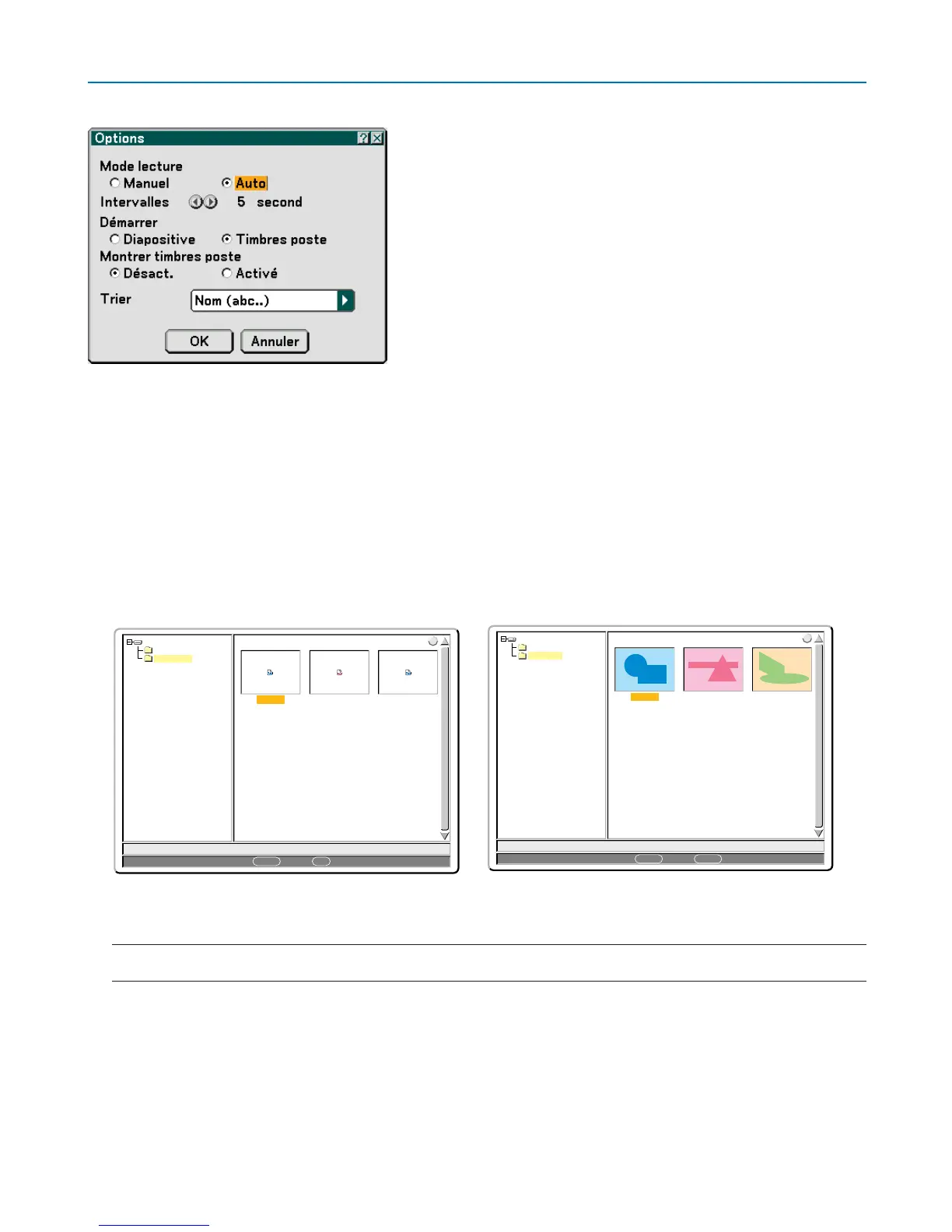 Auto ...................... Lit les diapositives automatiquement lorsque la source Visionneuse est sélectionnée.