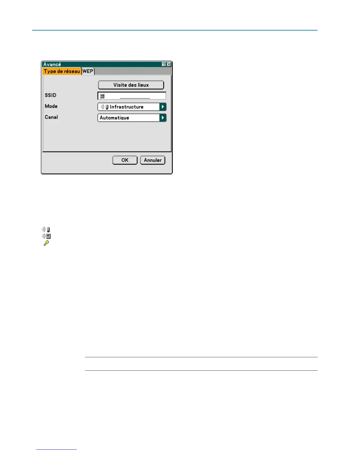Infrastructure ........ Sélectionner cette option lorsque vous communiquez avec un ou plusieurs équipements connectés au ré-