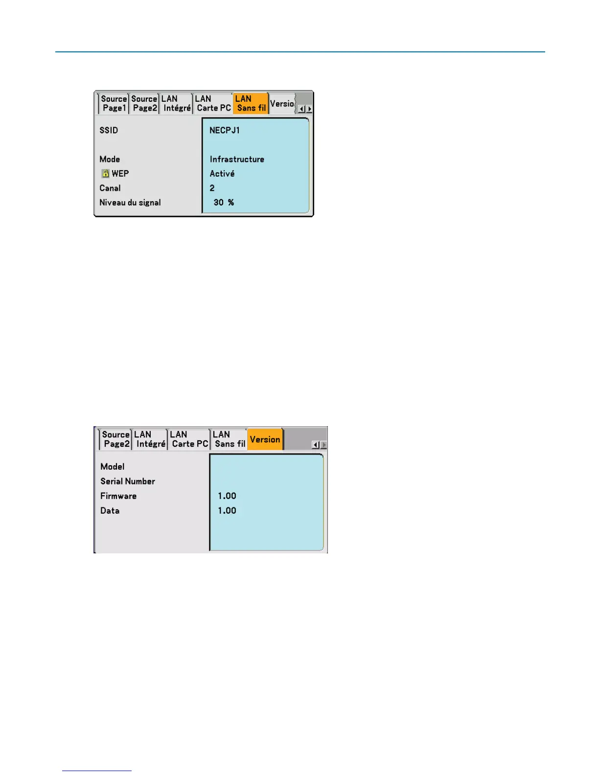 Canal ..................... Indique le canal sélectionné dans [Site Survey]. Le canal doit correspondre pour tous les dispositifs sans fil