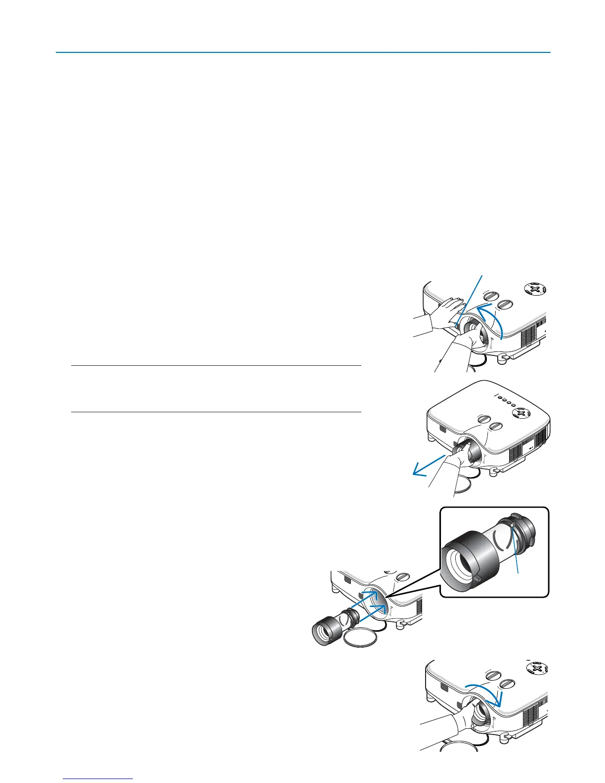 • Avant d’ôter ou de mettre en place l’objectif, assurez-vous que le projecteur est éteint, attendez que les ventilateurs