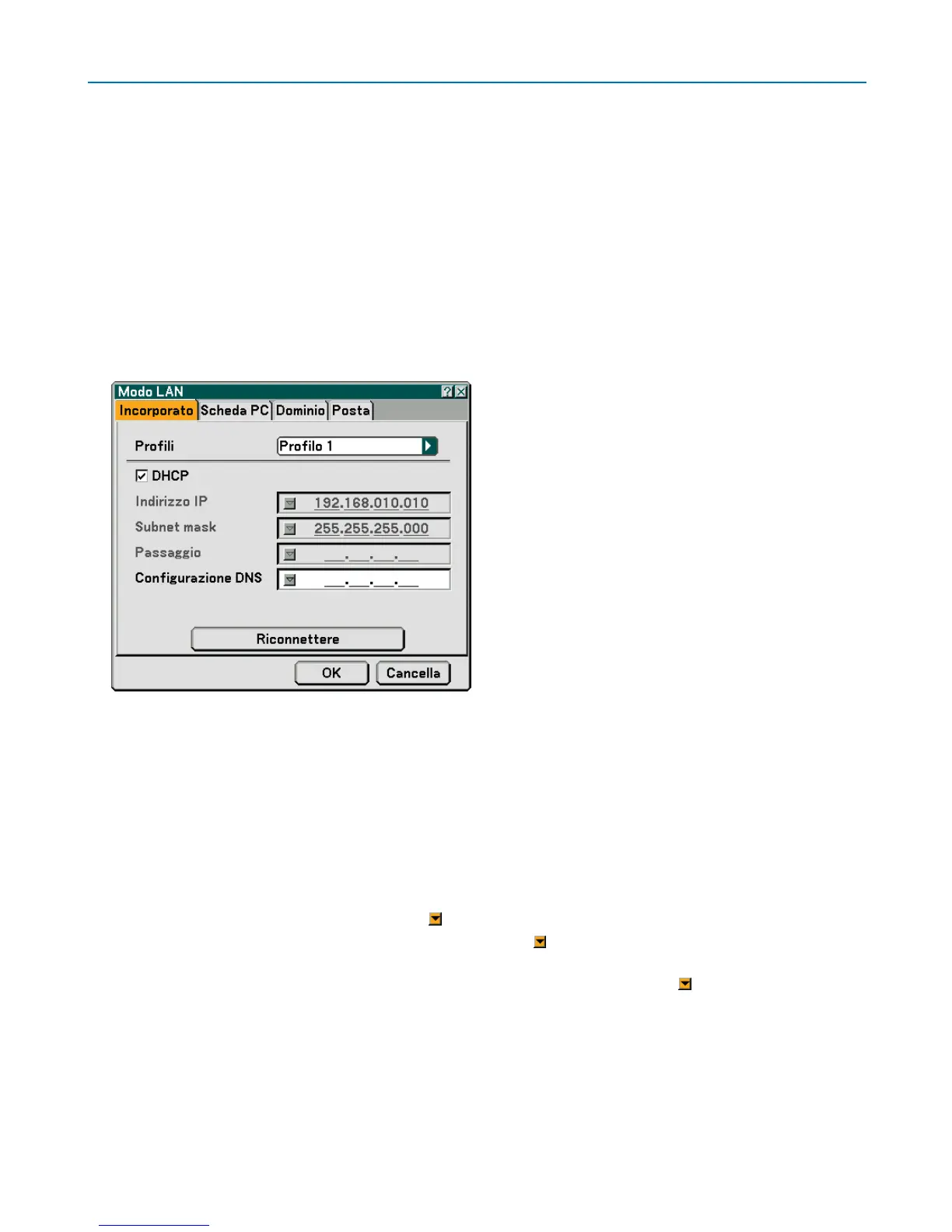 Riconnettere .......... Utilizzate questo tasto per connettere il proiettore alla rete.