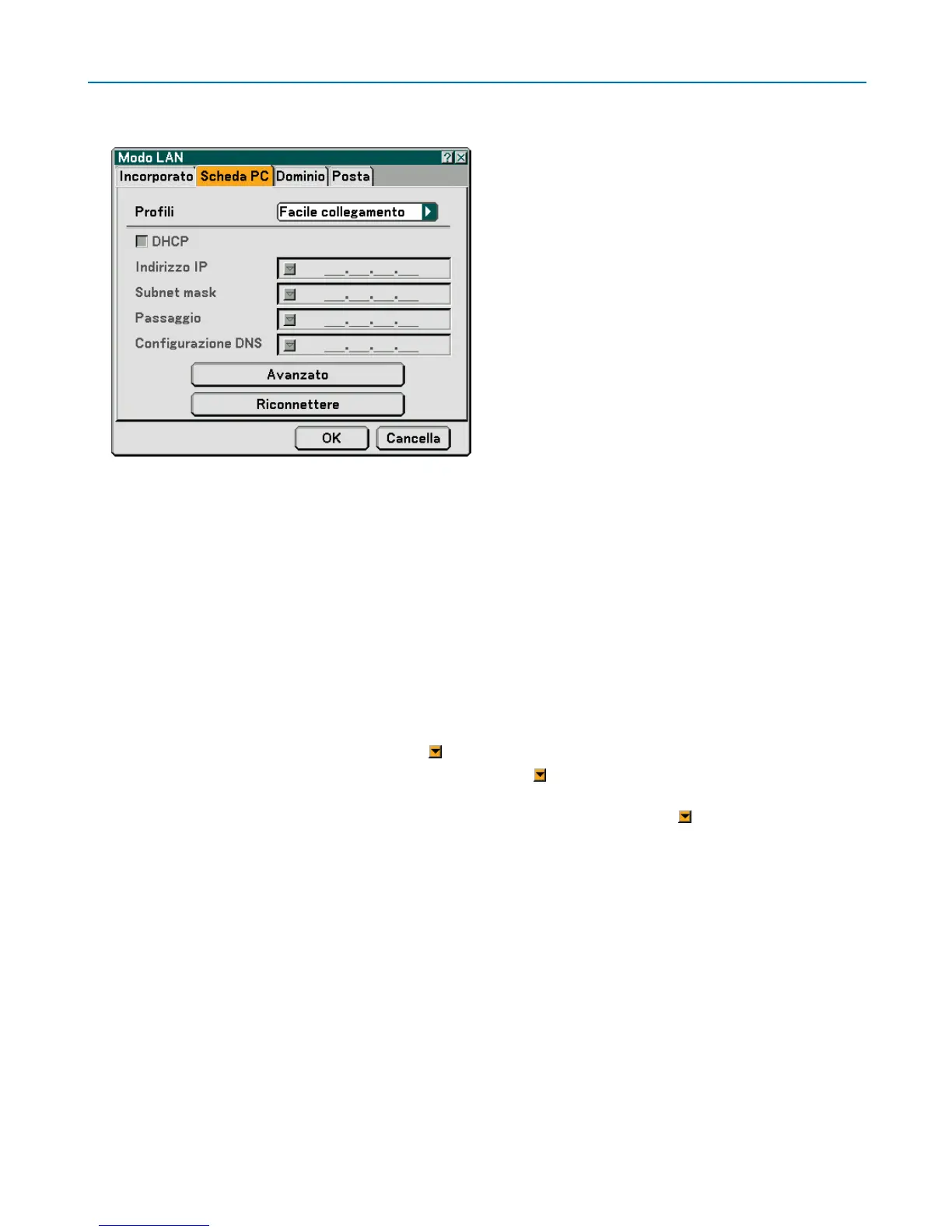 Riconnettere .......... Utilizzate questo tasto per connettere il proiettore alla rete.