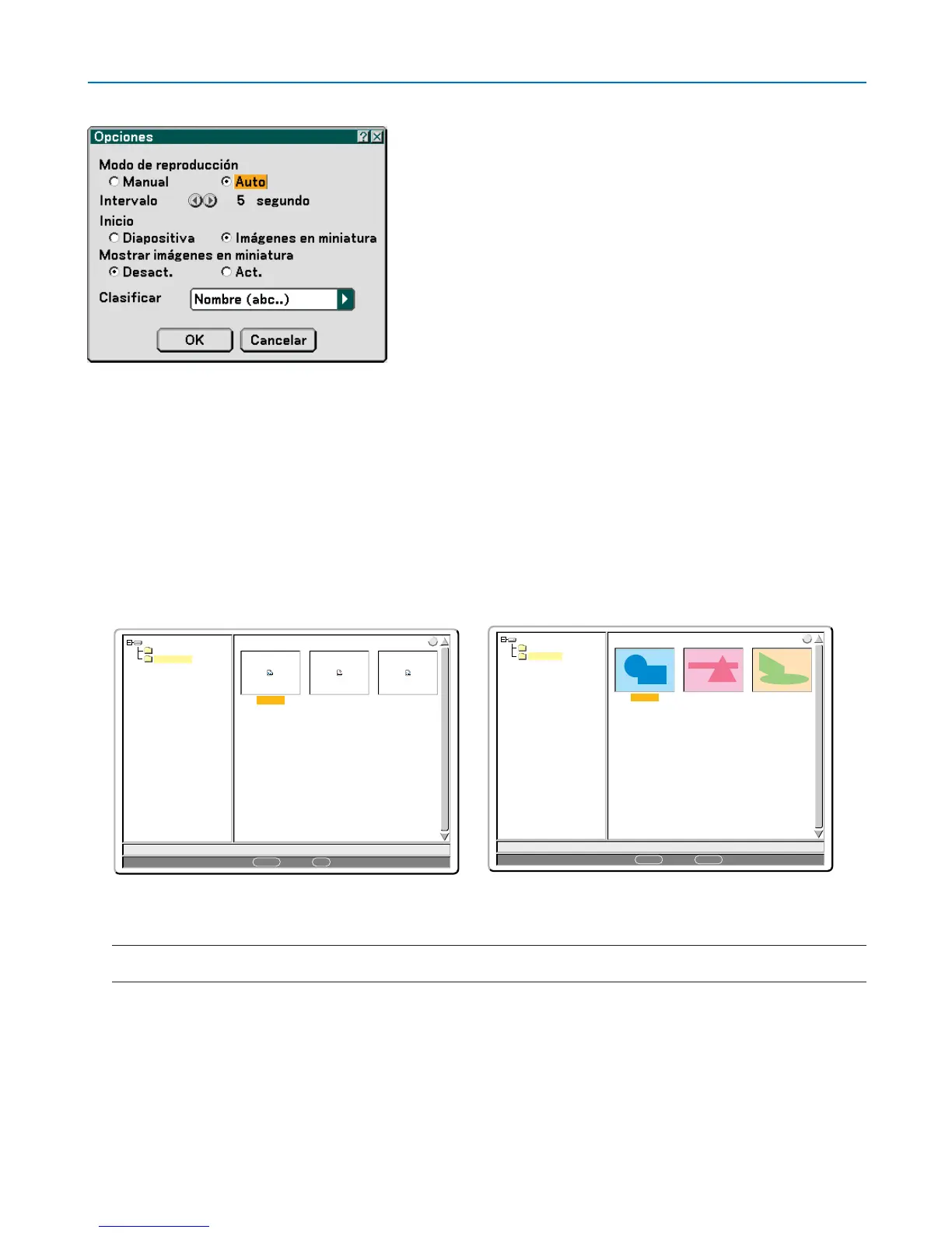 Manual .................. Con este ajuste se visualiza una diapositiva manualmente cuando se ha seleccionado la fuente Visor.