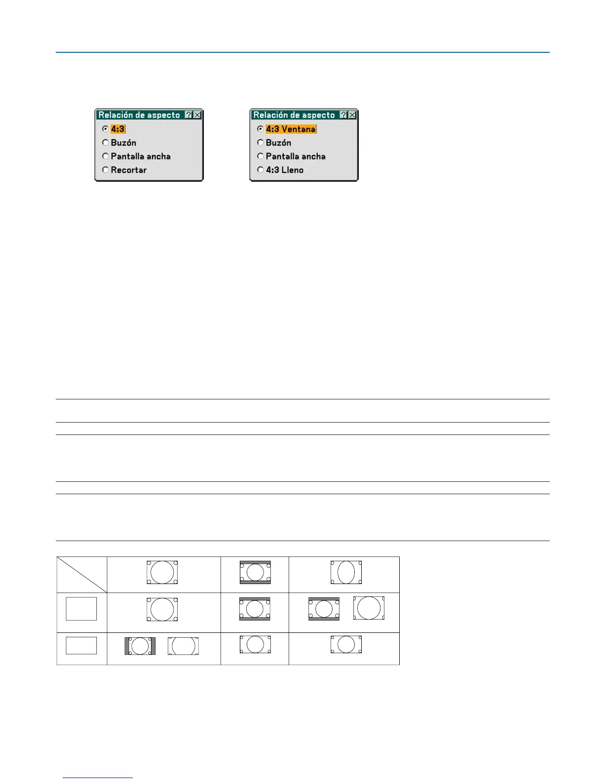 4:3 Ventana ........... Reducida para visualizar el aspecto real con bordes negros en el lado derecho e izquierdo