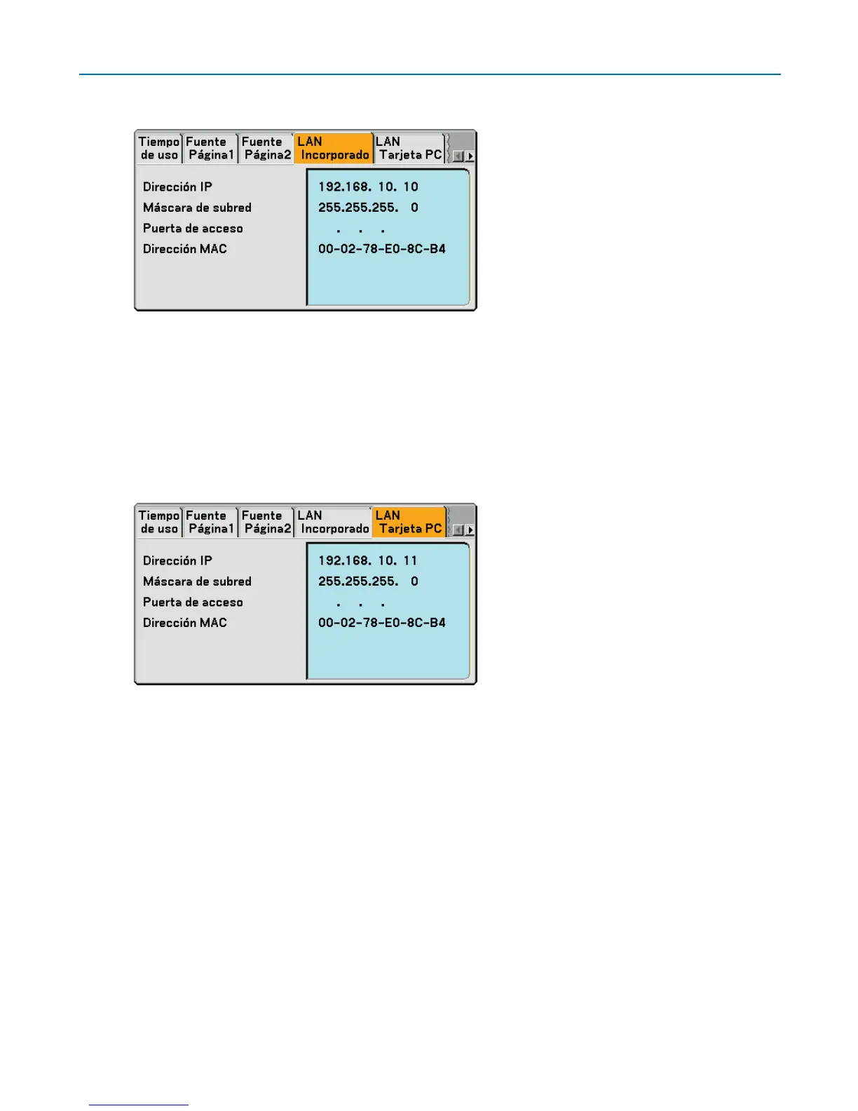 Puetra de acceso ... Muestra la puerta de acceso de la red conectada al proyector cuando se utiliza el puerto LAN (RJ-45).