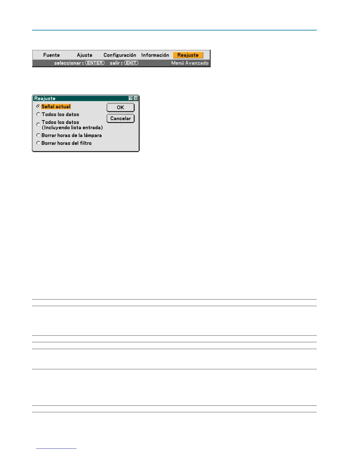 NOTA: El tiempo de uso transcurrido de la lámpara no se verá afectado aún cuando se reinicie [Reajuste] desde el menú.