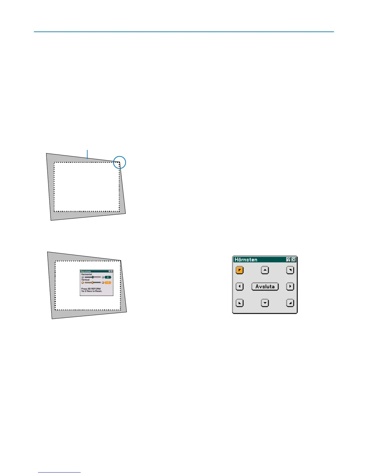 förlänga eller förkorta skärmens övre, nedre, högra eller vänstra kant så att den projicerade bilden blir rektangulär.