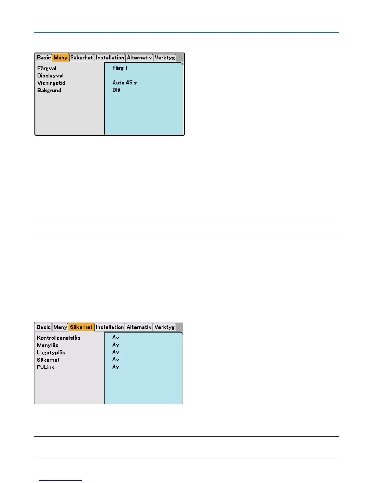 När kontrollpanelen är låst och du håller EXIT-tangenten på projektorhöljet intryckt i ungefär 10 sekunder ändras inställningen till [Av].