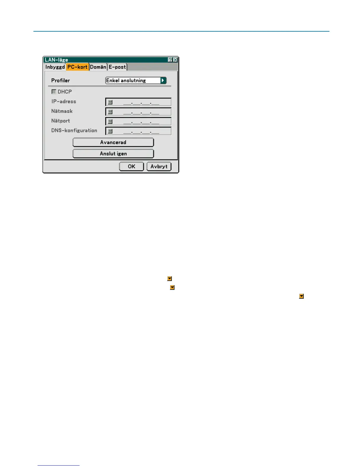Anslut igen ............ Denna knapp använder du till att ansluta projektorn till ett nätverk.