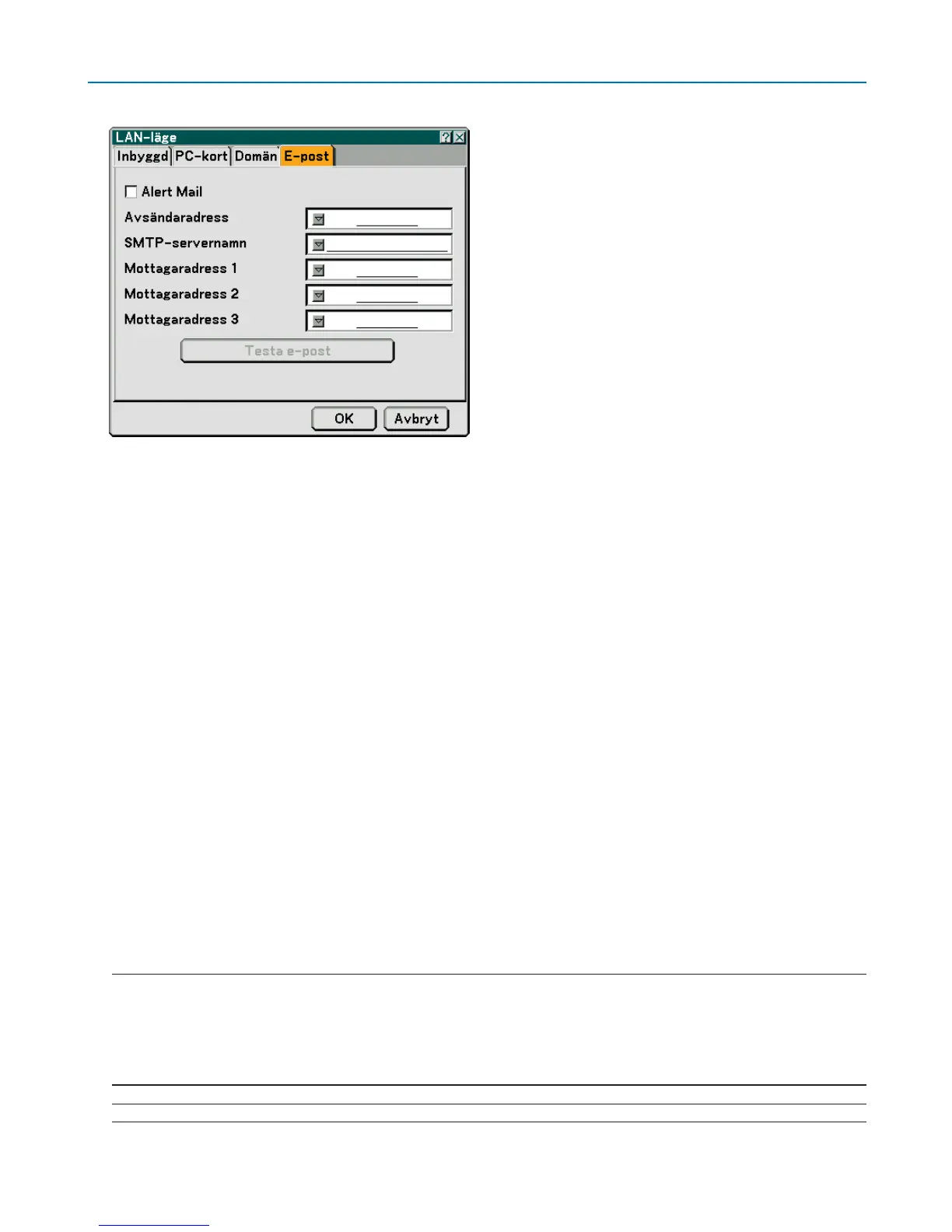 Ange namnet på den SMTP-server som projektorn ska anslutas till. Det går att använda upp till 60 alfanumeriska