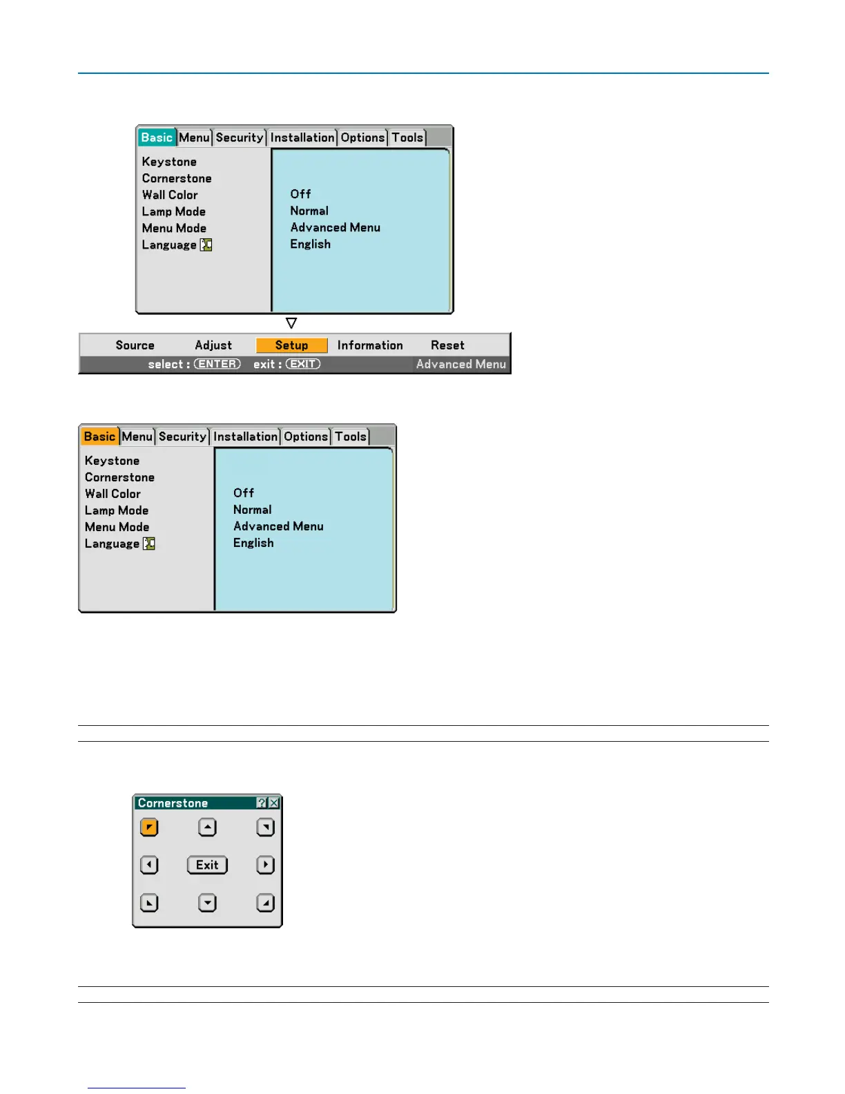 Selecting this item will display the Cornerstone adjustment screen. (→ page 41)