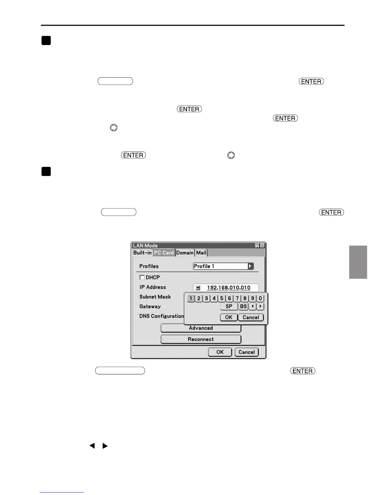• “ ”“ ” ........... Moves the character insertion position in the “IP Address” field to the left