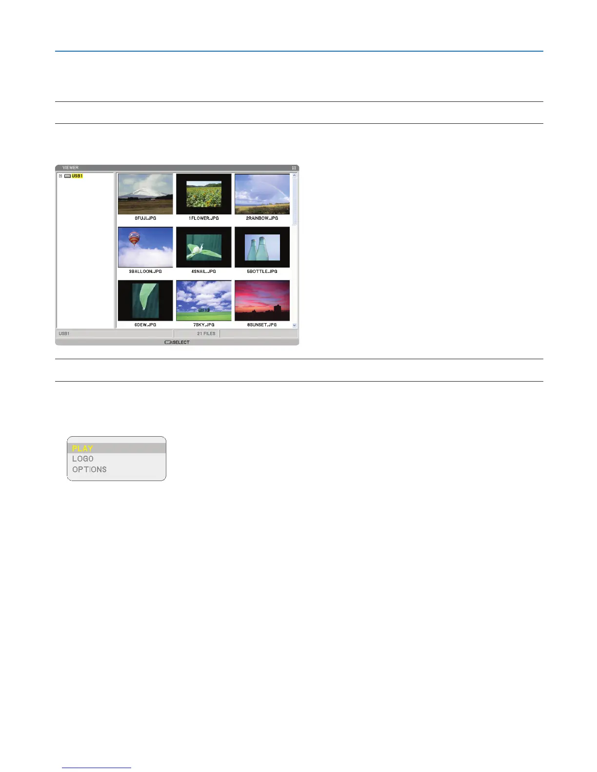 Preparation: Store JPEG or BMP files (JPEG, BMP, non-interlaced GIF or non-interlaced PNG files) in a USB mem-