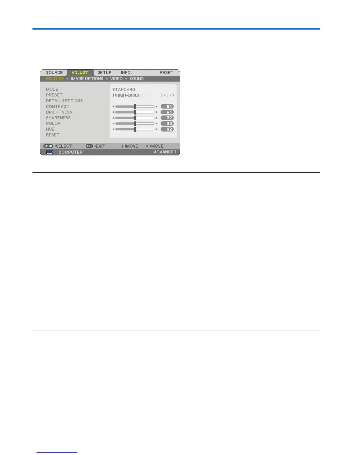 7. Repeat steps 2 -6 to adjust an additional item, or press the EXIT button on the remote control or the pro-