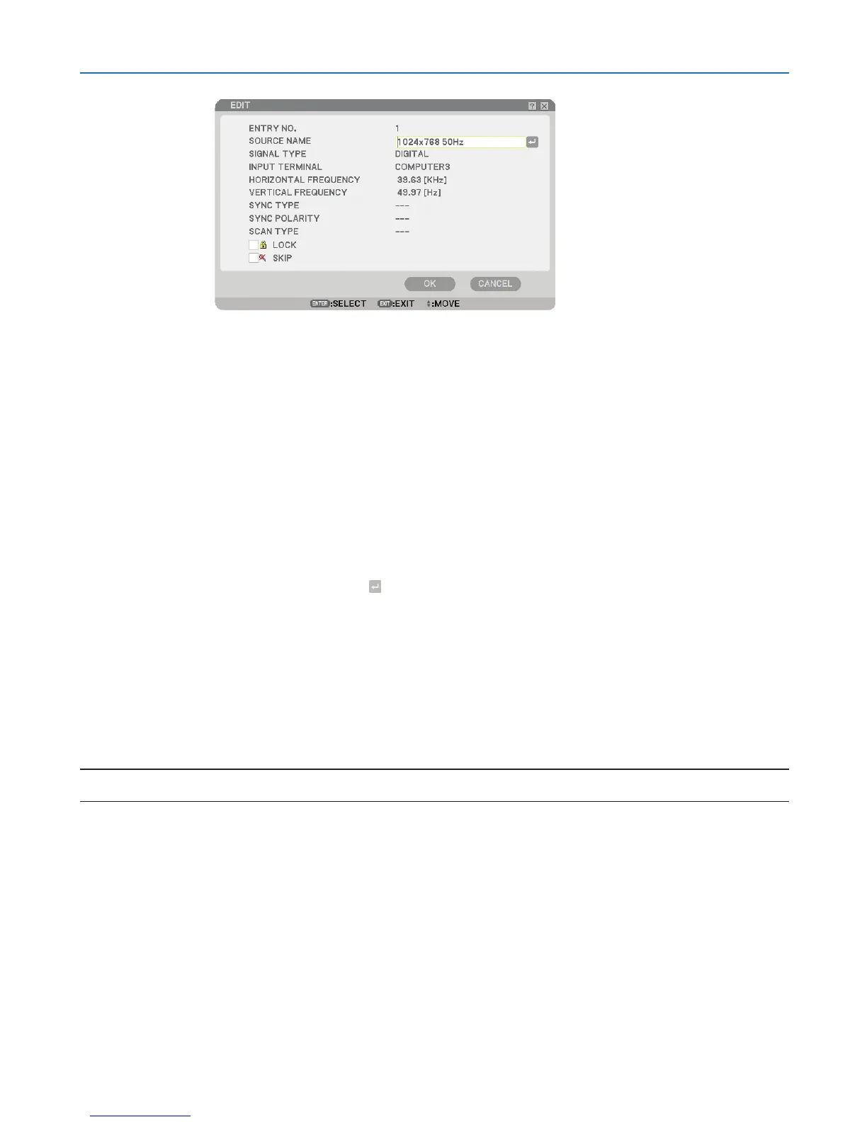 [SOURCE NAME] and press ENTER to display the Source Name Edit window. You can change source