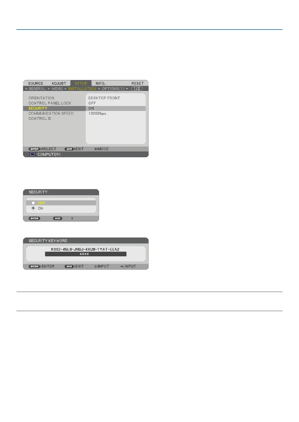 → [INSTALLATION] → [SECURITY] and press the ENTER button.