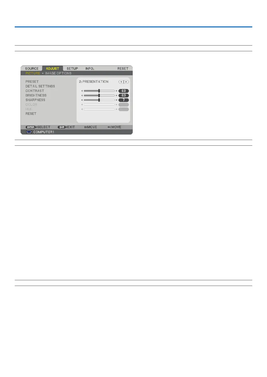 7. Repeat steps 2 -6 to adjust an additional item, or press the EXIT button on the remote control or the projec