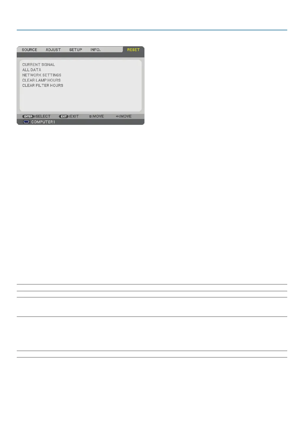 NOTE: Elapsed time of the lamp use will not be affected even when [RESET] is done from the menu.