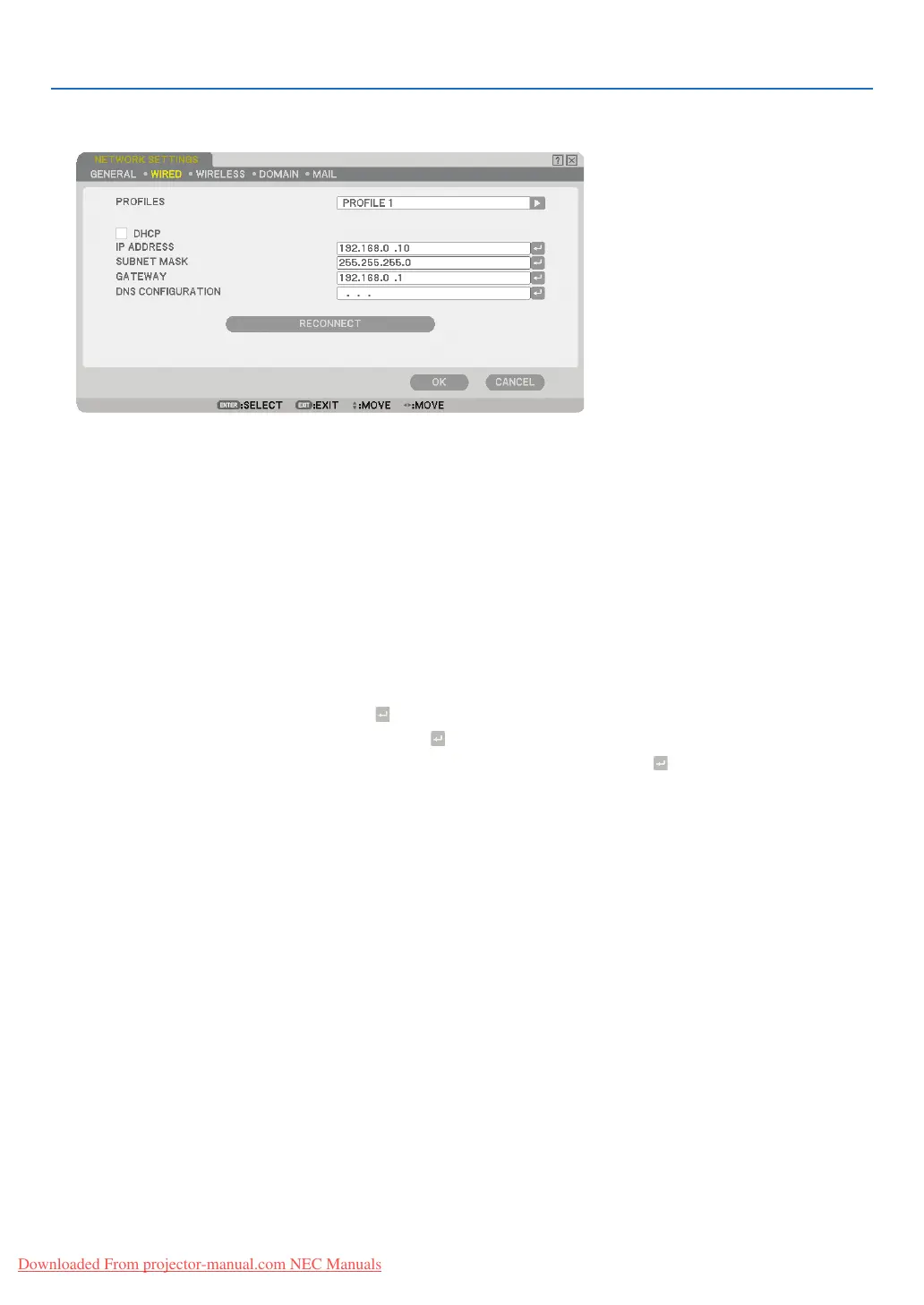 Select [PROFILE 1] or [PROFILE 2] and then do settings for [DHCP] and the other options.