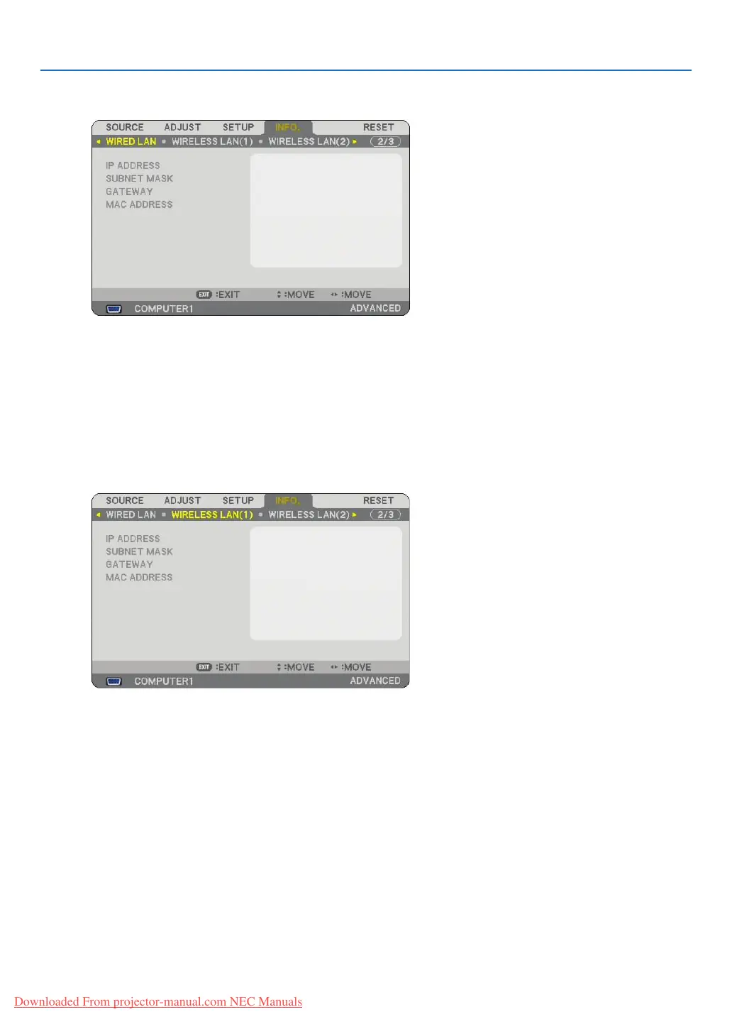 IP ADDRESS .......... Indicates the IP address of the projector when the LAN port (RJ-45) is used.