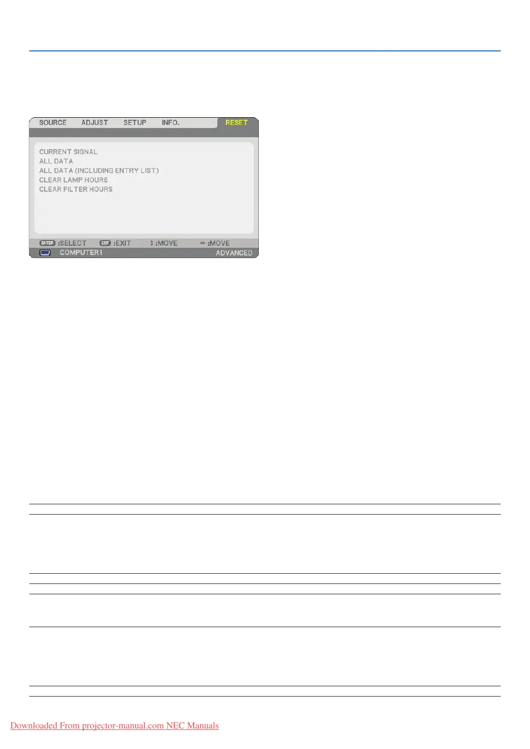 NOTE: Elapsed time of the lamp use will not be affected even when [RESET] is done from the menu.