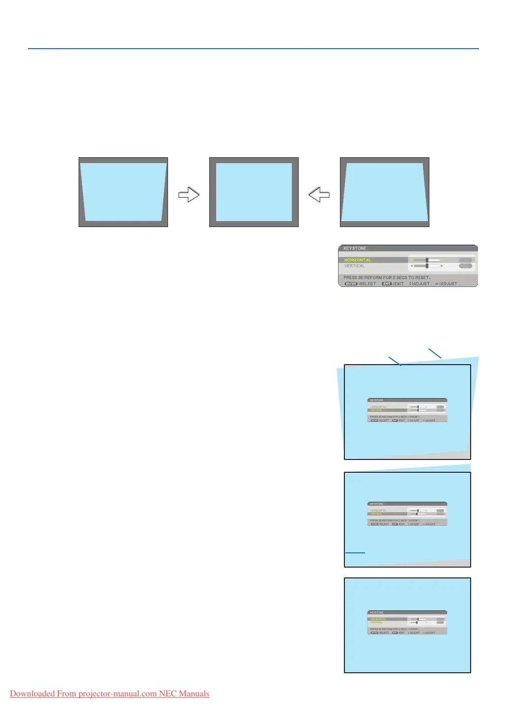 When the projector is not exactly perpendicular to the screen, keystone distortion occurs. To overcome it, you can use the