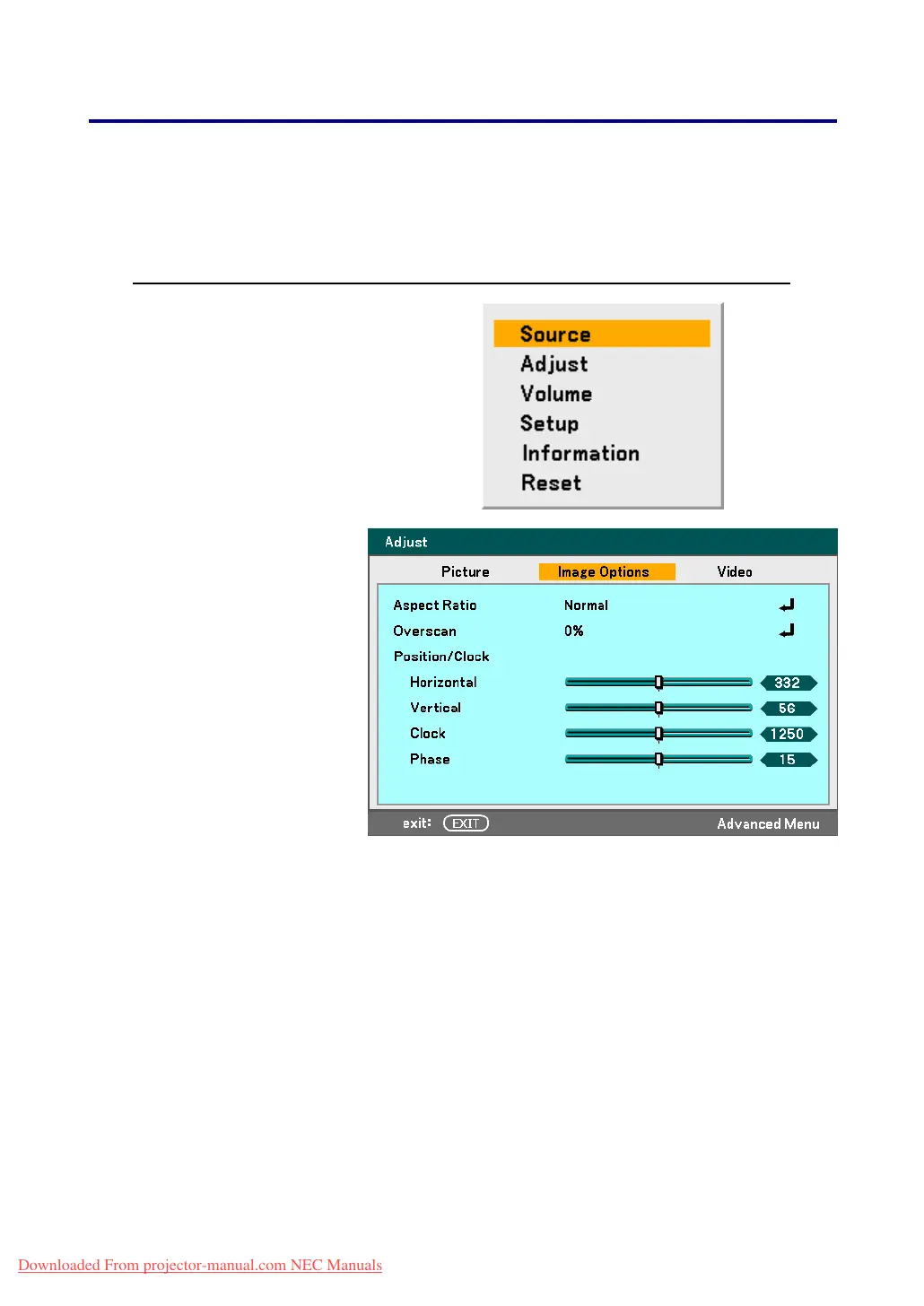 The Position/Clock/Phase and Keystone Correction can be adjusted manually from the pro-