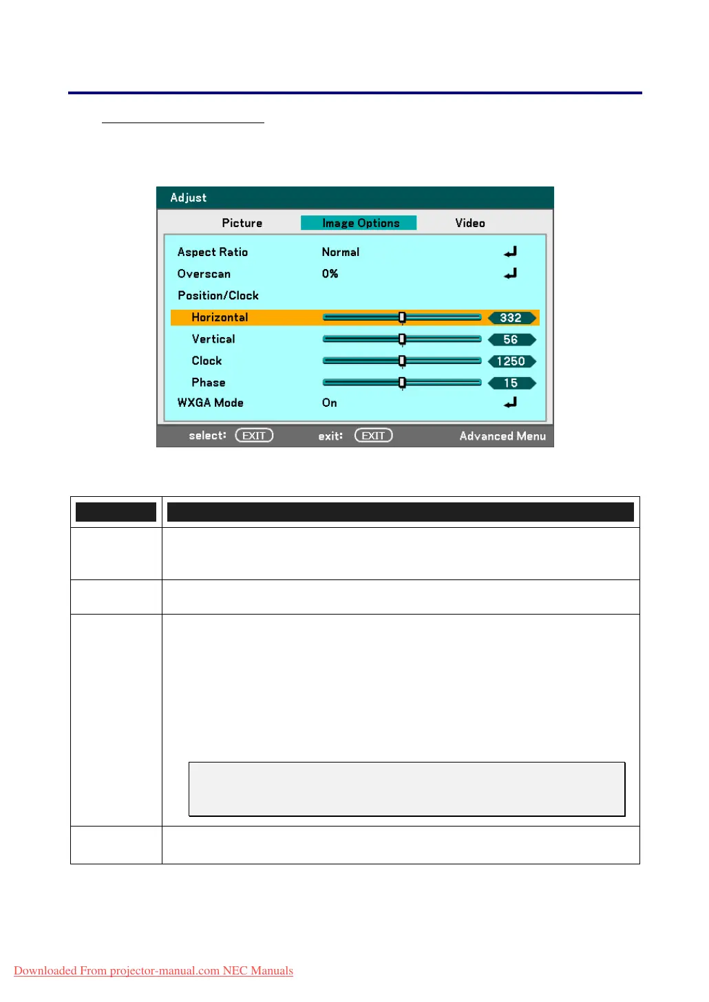 Horizontal: Adjusts the image location horizontally using ◄or►.