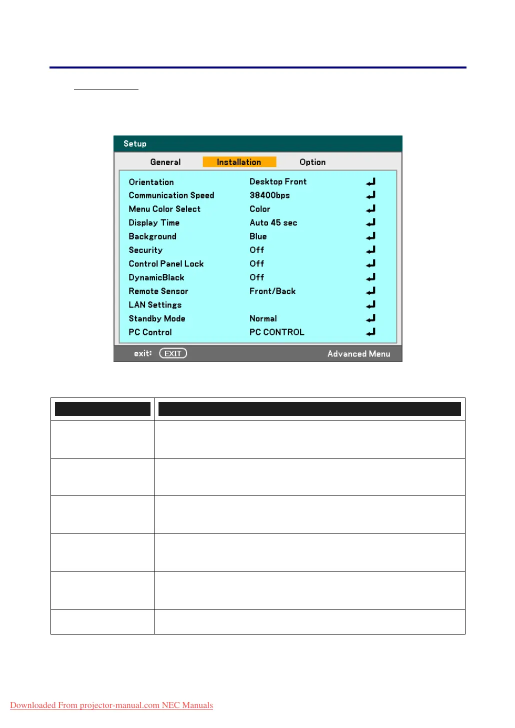 The Installation tab contains menu options for various setup conditions such as orienta-