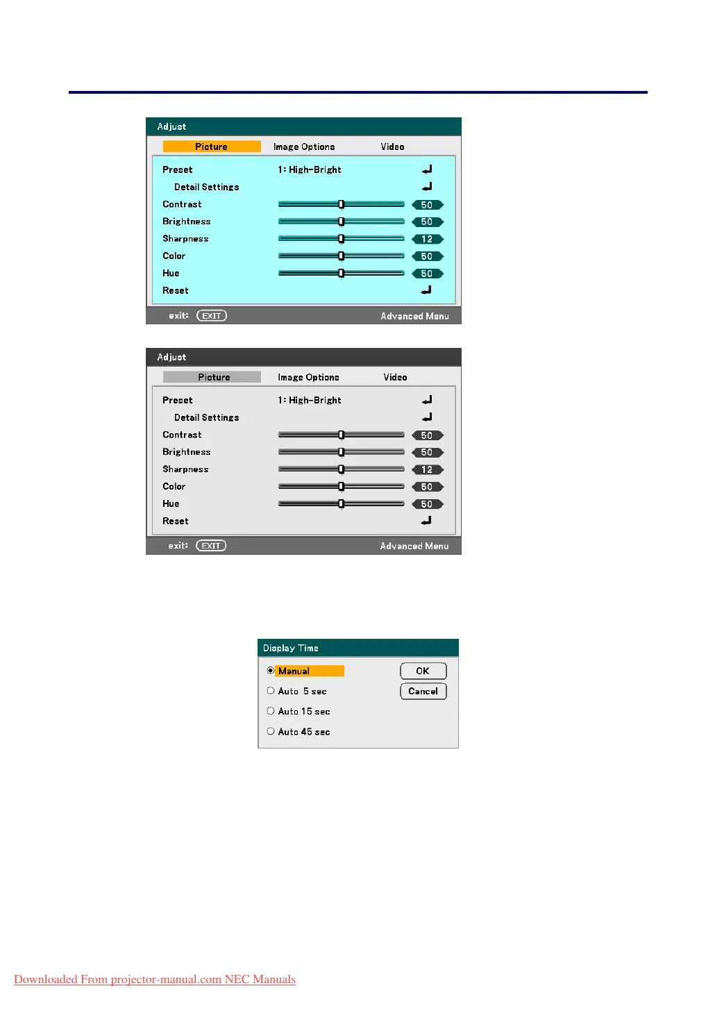 Manual – Menus stay on screen until the Menu button is pressed again.