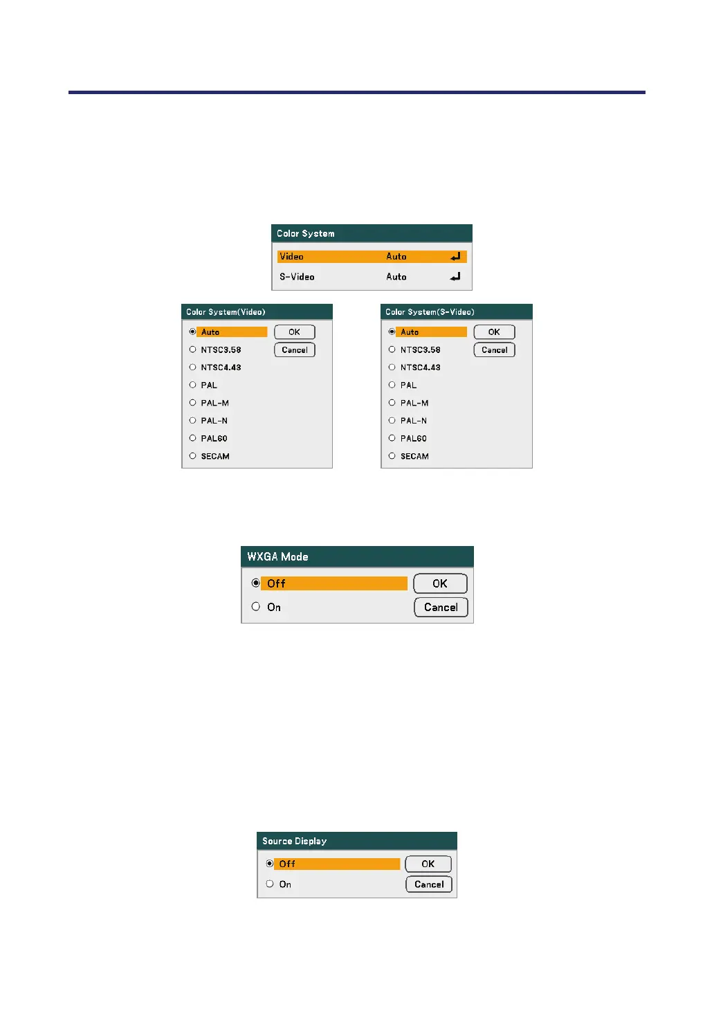 Selecting On will give priority to a WXGA (1280 x 800) signal in recognizing an input