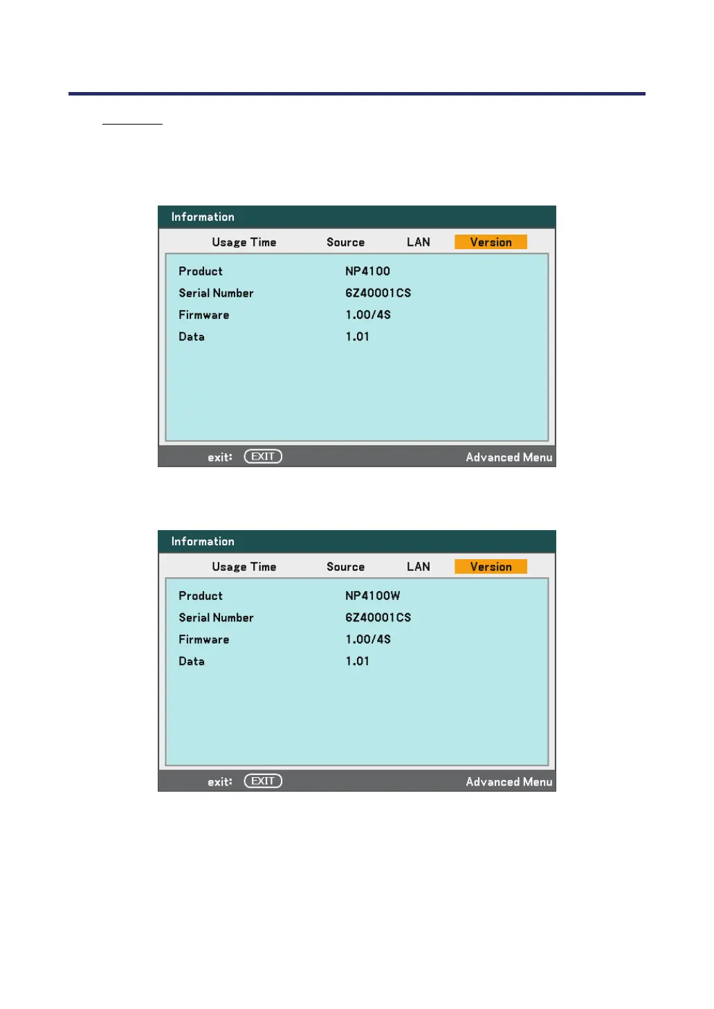 NP4100W Version Screen: