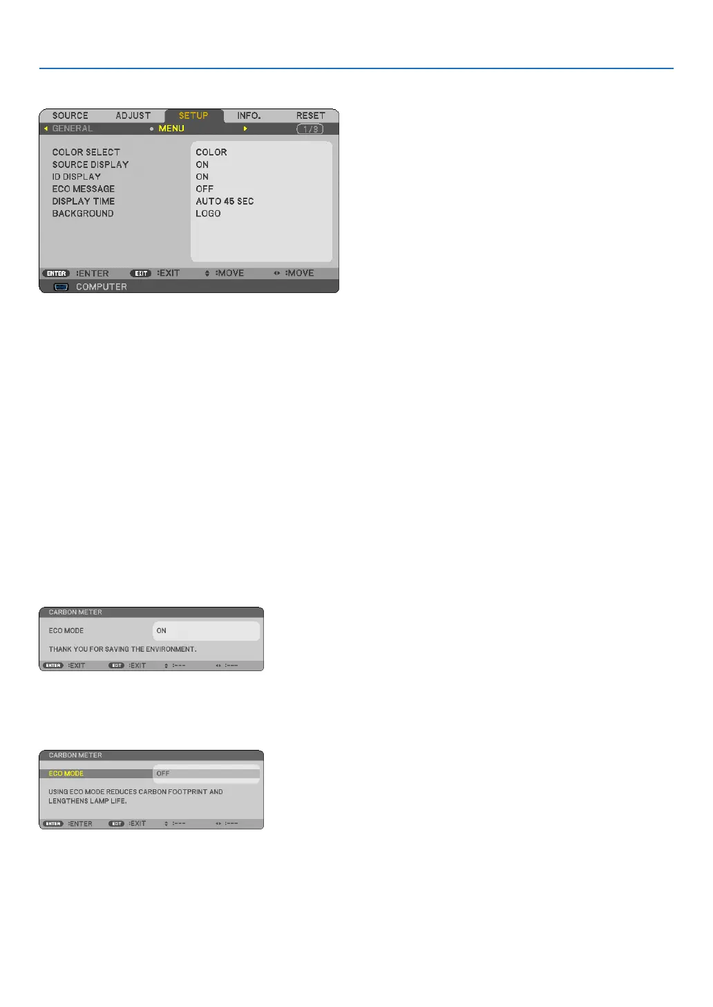 TheEcoMessagepromptstheusertosaveenergy.When[OFF]isselectedfor[ECOMODE],youwillgetames-