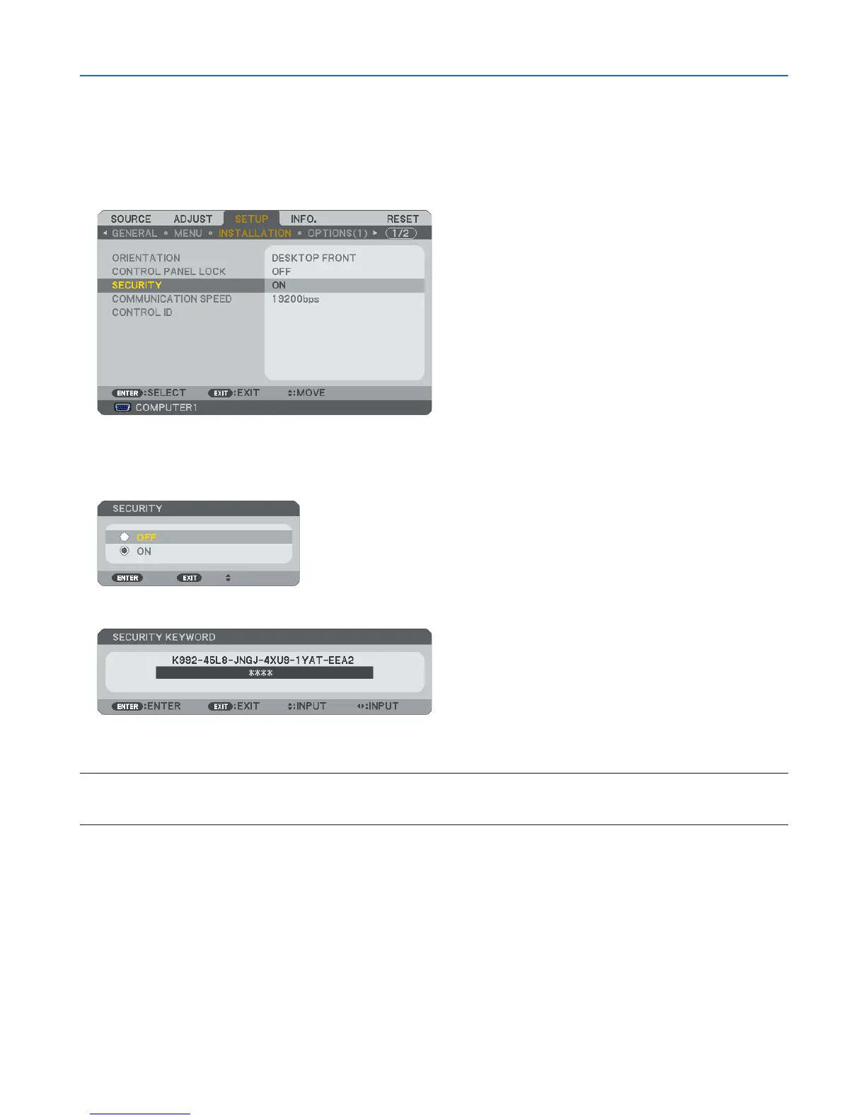 → [INSTALLATION] → [SECURITY] and press the ENTER button.