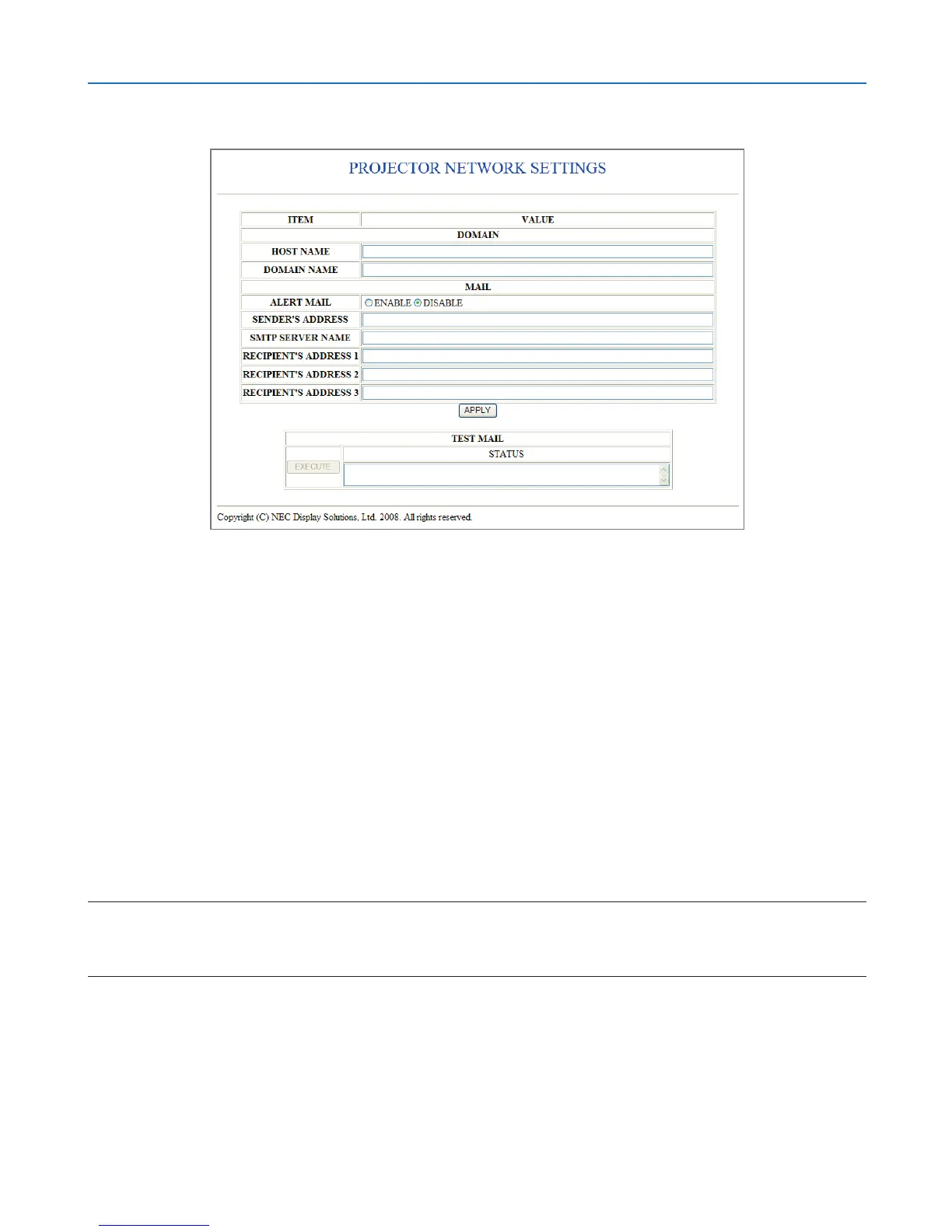 DOMAIN NAME ........................ Type in the domain name of the network connected to the projector. Up to 60 alphanumeric