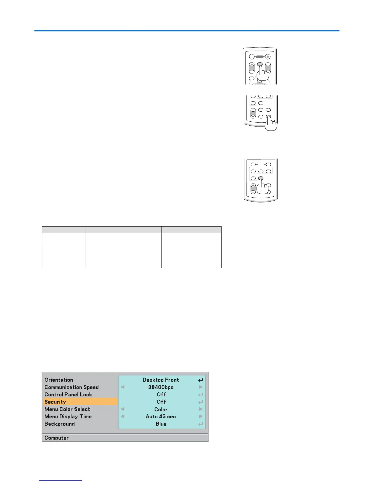2. Use SELECT ▲ or ▼ button to select [Setup - Installation] → [Security] and press the ENTER button.